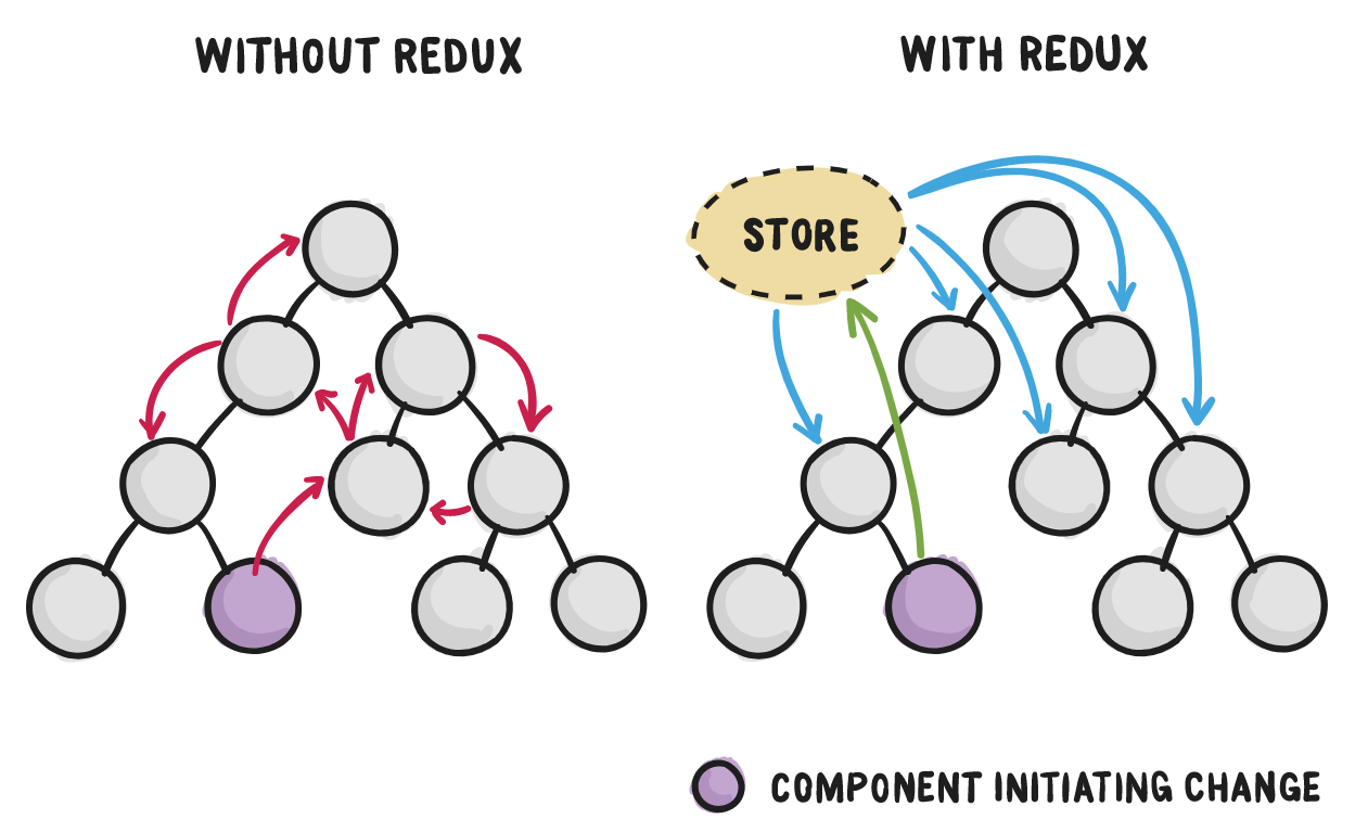 - redux는 중앙에 데이터 저장소를 하나 만들고, 모든 컴포넌트는 그 저장소와 직접 연결된다.