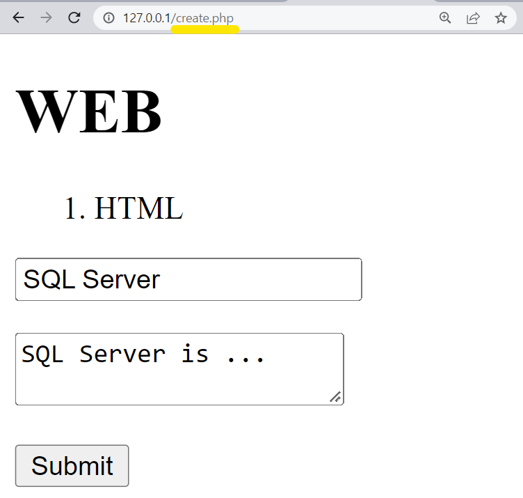 2. create.php 파일 생성: title 입력 박스, description 입력 박스 생성