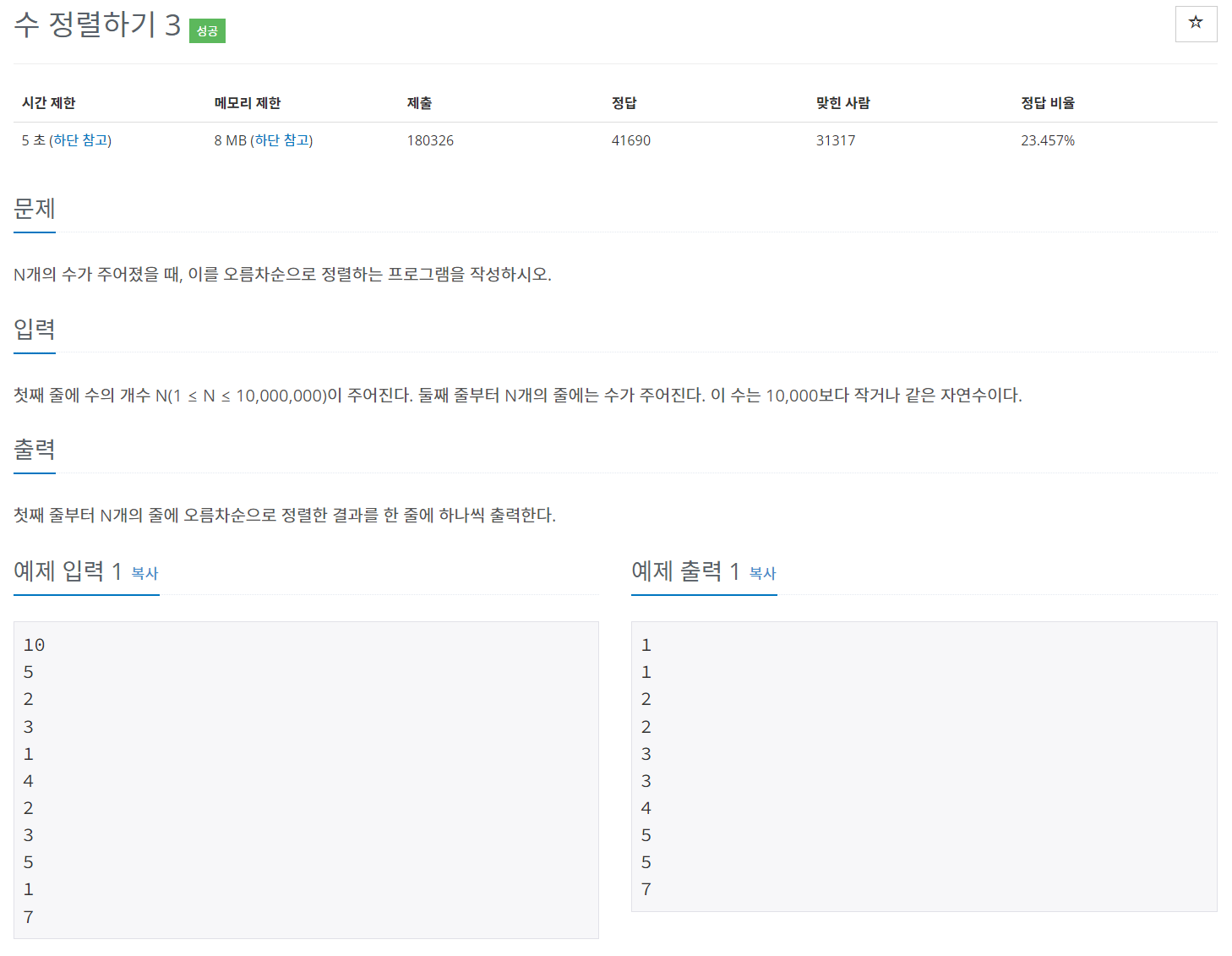 [C언어] 백준 10989번: 수 정렬하기 3 본문