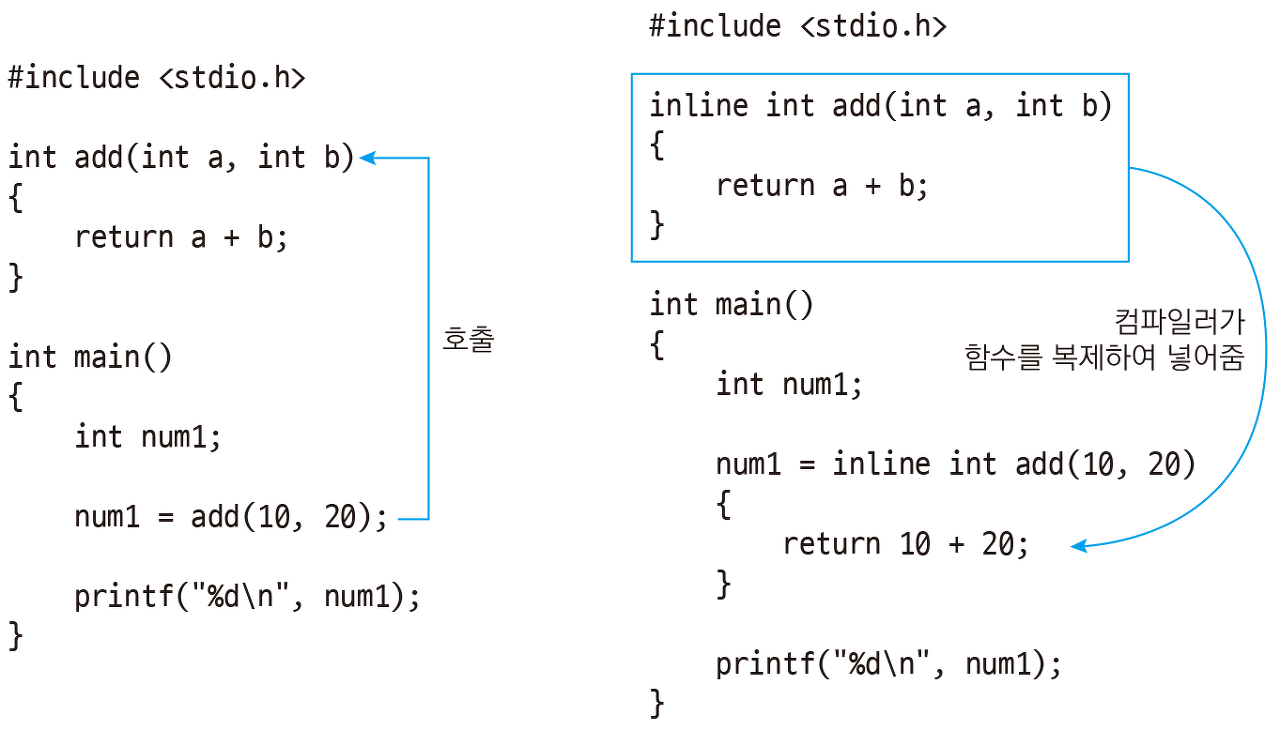- 함수의 코드가 복제되므로, 함수를 많이 사용하면 실행 파일의 크기가 커진다.