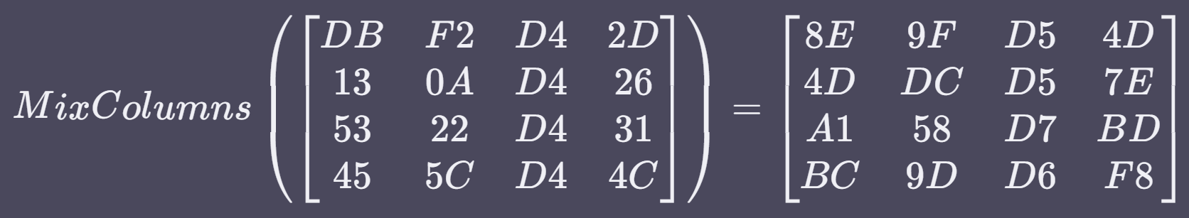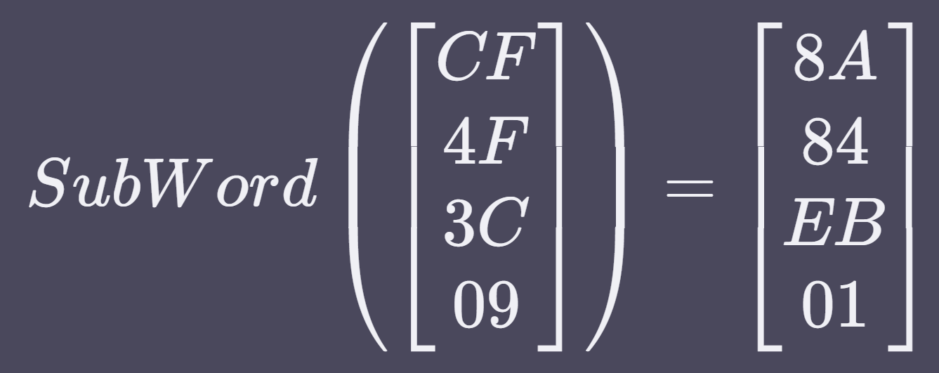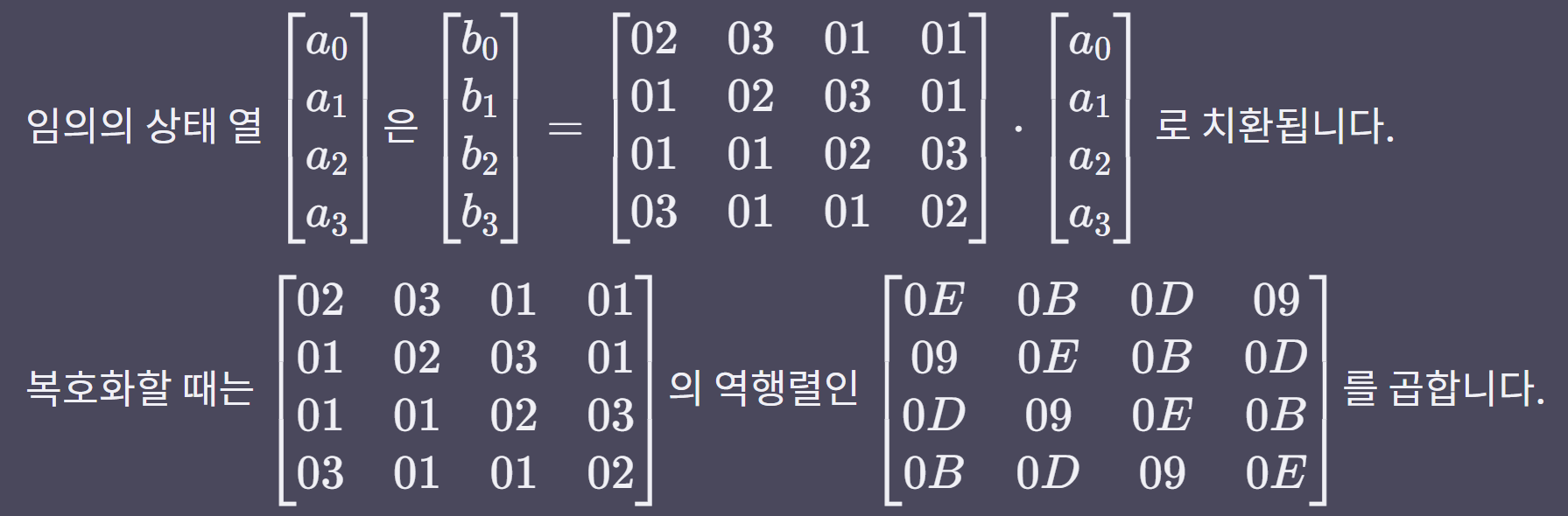 - 이 치환은 갈루아 필드 내에서의 행렬 연산으로 구해진다.