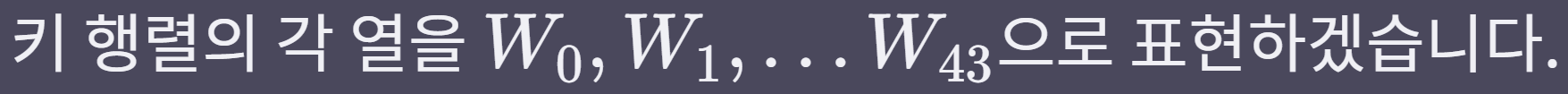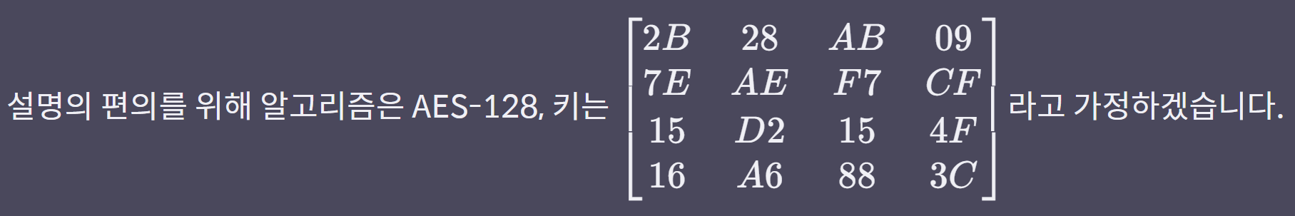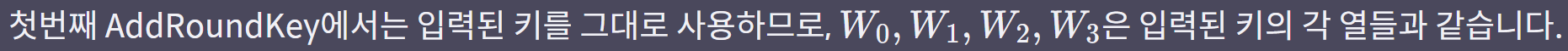- AES는 암복호화를 시작할 때와 매 라운드마다 AddRoundKey 함수를 적용한다. 따라서 AES-128에서는 라운드 키가 11개 필요하다. 각 라운드 키는 4행 4열의 행렬이므로, 4행 44열의 키 행렬을 하나 만들고, 이를 4열씩 나눠서 매 AddRoundKey마다 사용하면 된다.