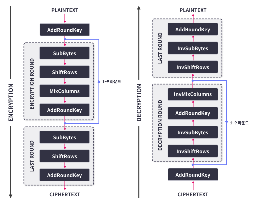 - AES의 라운드 함수들은 역함수가 존재하므로, 역함수를 이용하여 AES 복호화가 이뤄진다.