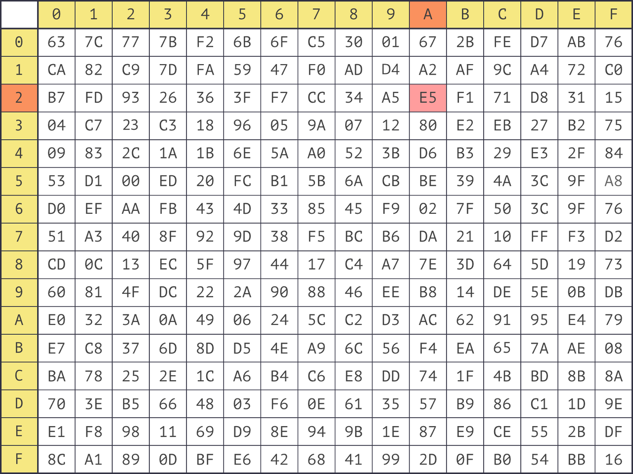 - 예를 들어 어떤 바이트가 2A라면, 해당 바이트는 S-box의 2행 A열을 참조하여 E5로 치환된다.