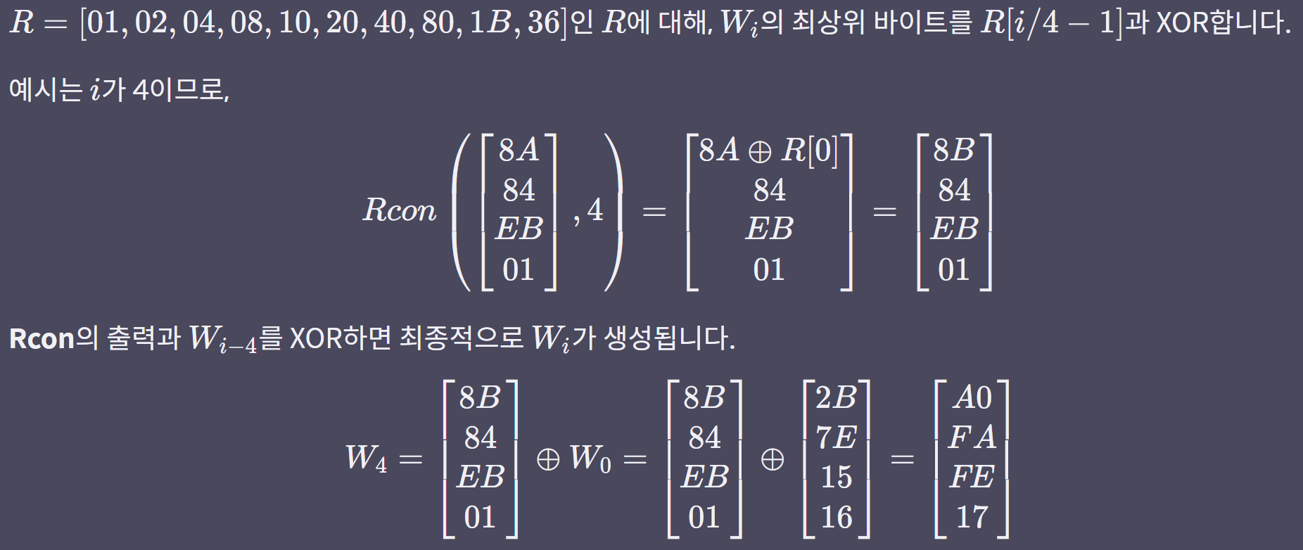 - Rcon, 그리고 열과 기존의 열을 XOR하는 과정은 키의 길이에 따라 조금 차이가 있다.