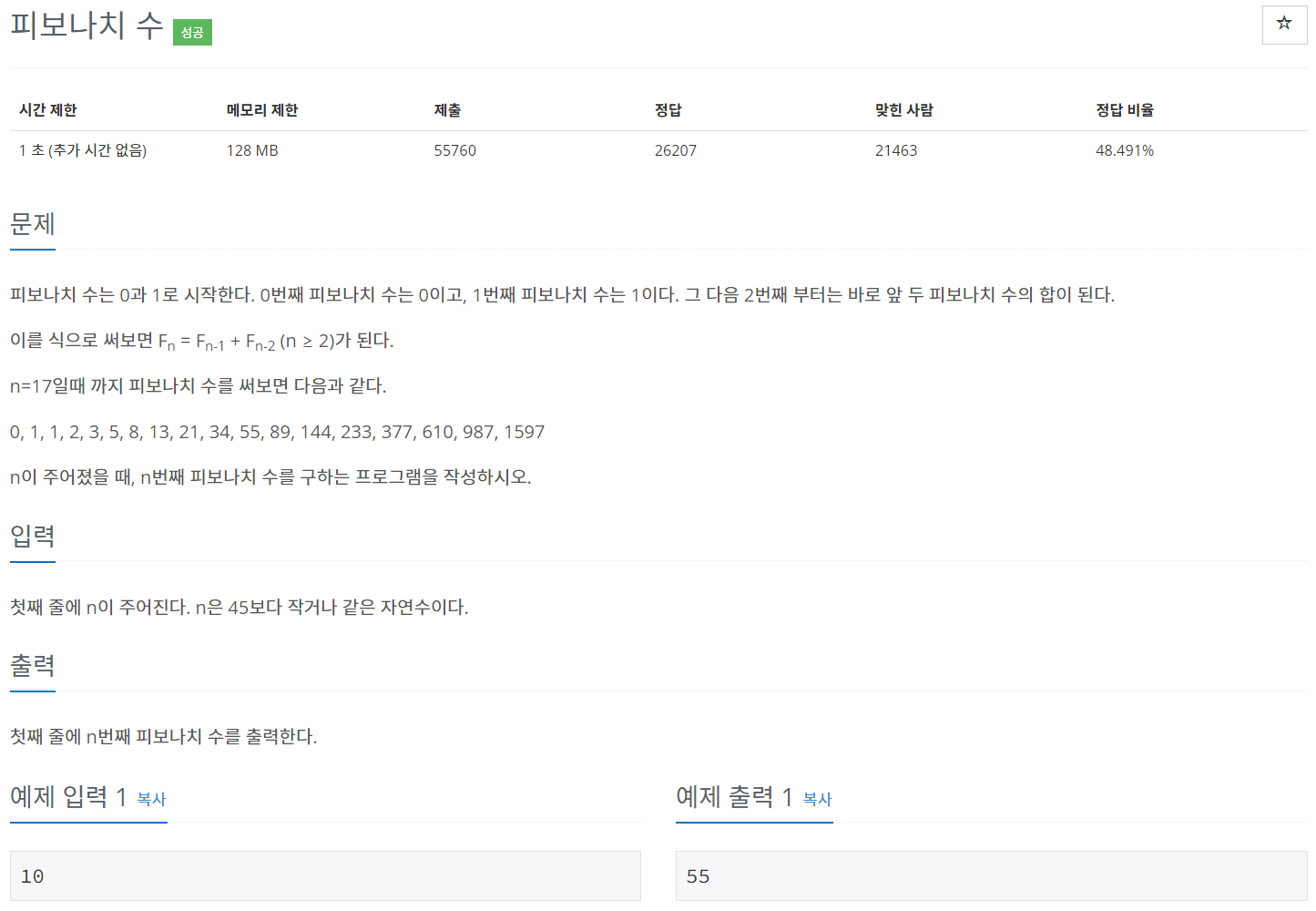 피보나치 수는 0과 1로 시작한다. 0번째 피보나치 수는 0이고, 1번째 피보나치 수는 1이다. 그 다음 2번째 부터는 바로 앞 두 피보나치 수의 합이 된다. 이를 식으로 써보면 Fn = Fn-1 + Fn-2 (n ≥ 2)가