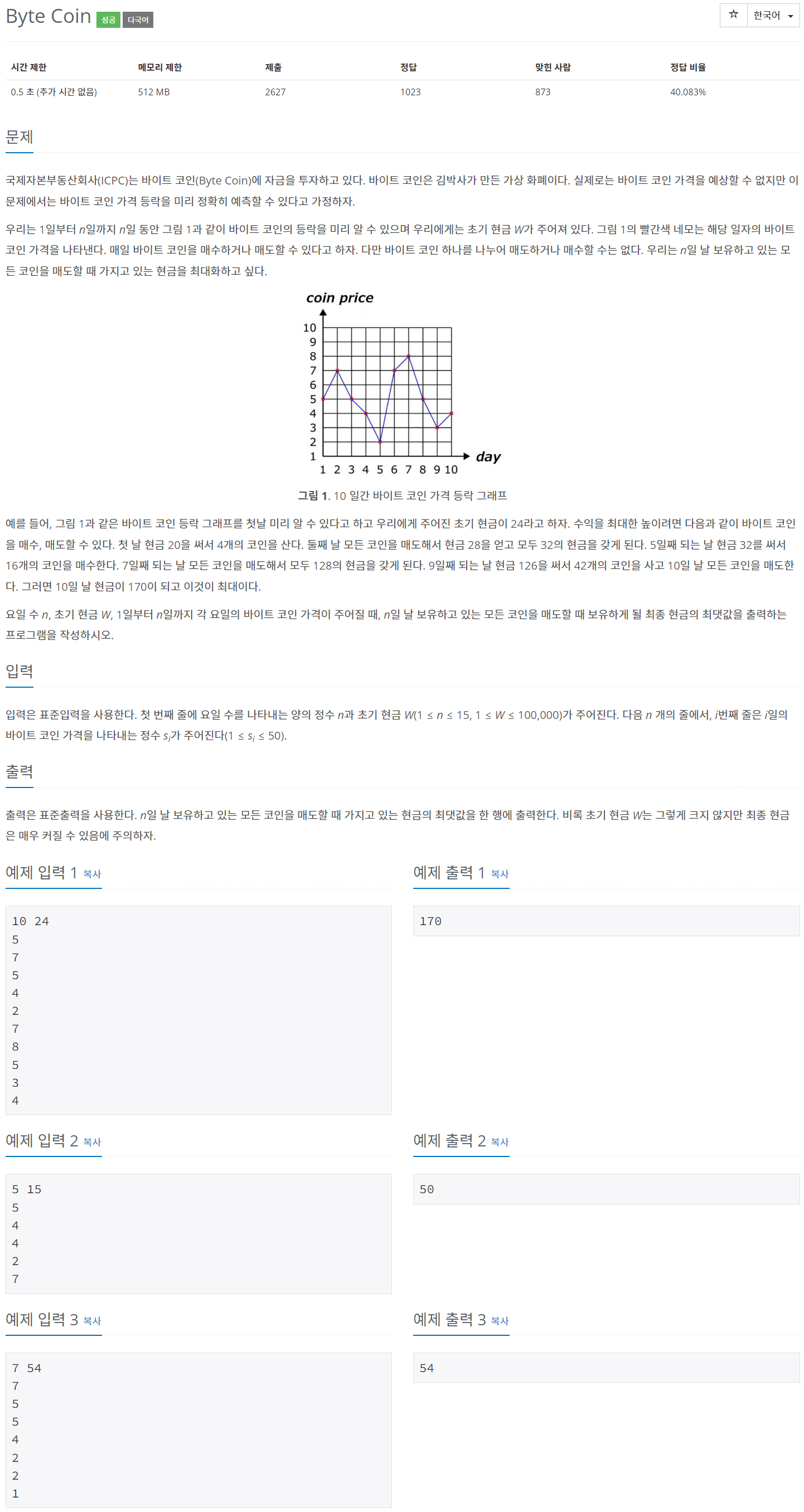 입력은 표준입력을 사용한다. 첫 번째 줄에 요일 수를 나타내는 양의 정수 n과 초기 현금 W(1 ≤ n ≤ 15, 1 ≤ W ≤ 100,000)가 주어진다. 다음 n 개의 줄에서, i번째 줄은 i일의 바이트 코인 가격을 나
