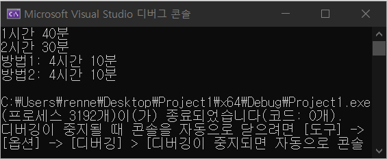 std::cout << hours << "시간 " << mins << "분" << std::endl;
