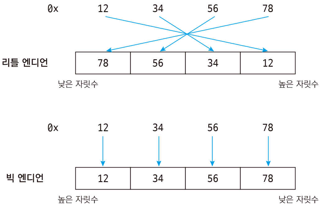 | 빅 엔디언 | 최상위 바이트부터 메모리에 저장하는 방식 | 모토로라 계열의 CPU |