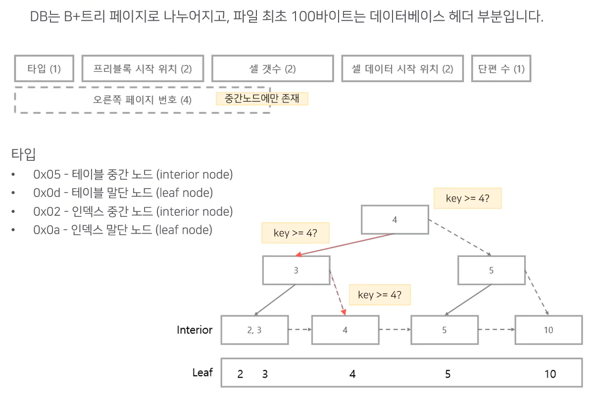- 타입: 테이블의 인테리어 노드(0x05), 테이블의 리프 노드(0x0d), 인덱스의 인테리어 노드(0x02), 인덱스의 리프 노드(0x0a) 중 무엇인지 구분