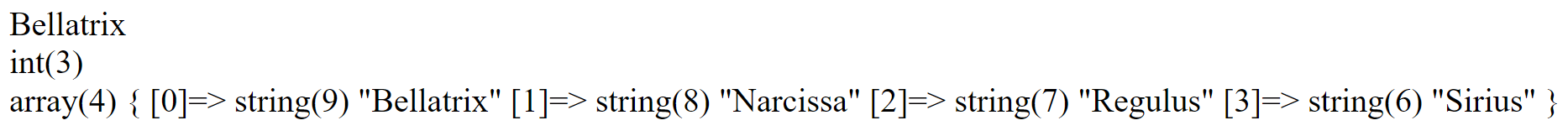 $black = array('Bellatrix', 'Narcissa', 'Regulus'); //배열 생성