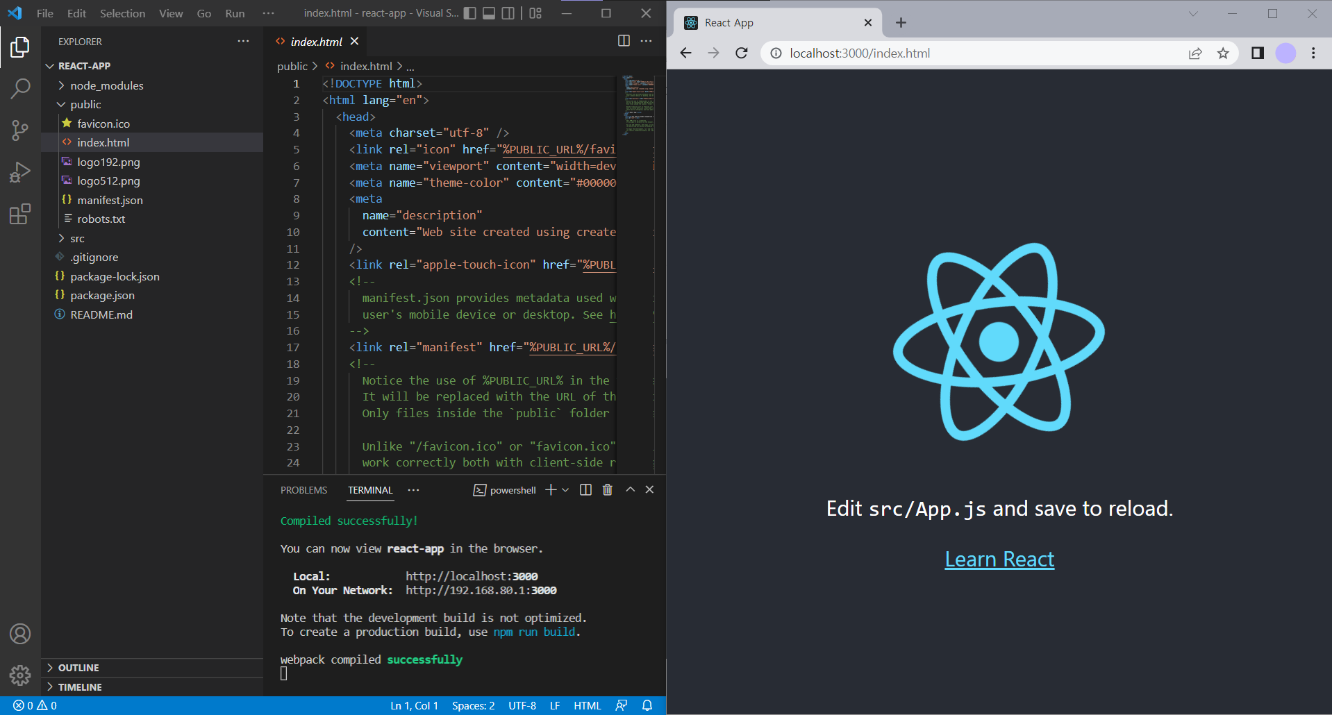 - 아래 사진의 오른쪽 창(React 샘플 웹 app)이 웹브라우저에서 index.html을 실행한 결과이다.