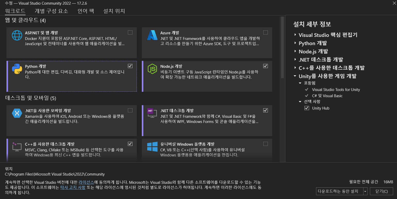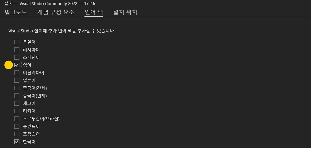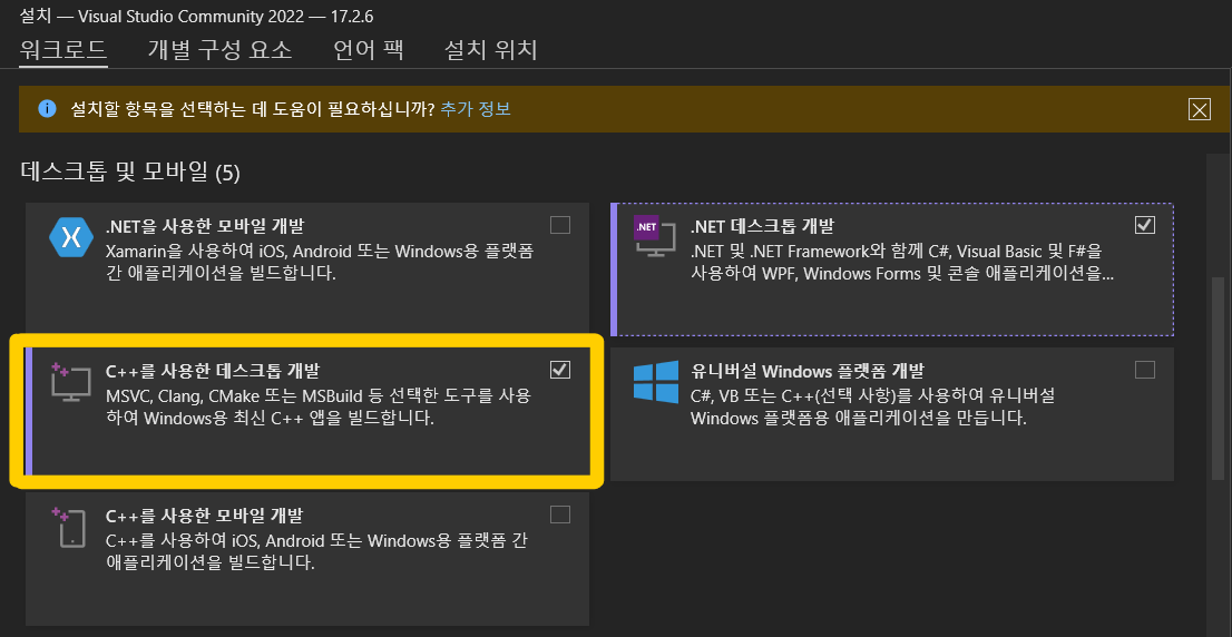 2. 워크로드: C++를 사용한 데스크톱 개발 선택