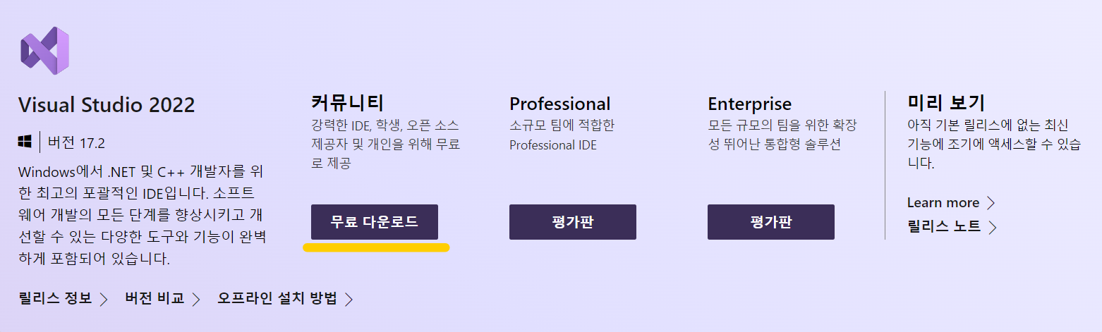 1. Visual Studio 다운로드: https://visualstudio.microsoft.com/ko/downloads/