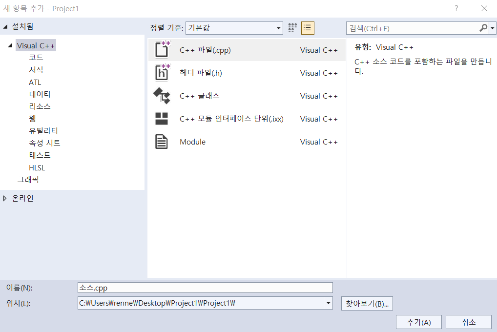 5. 소스 파일 오른쪽 클릭 → 추가 → 새 항목 또는 Ctrl + Shift + A