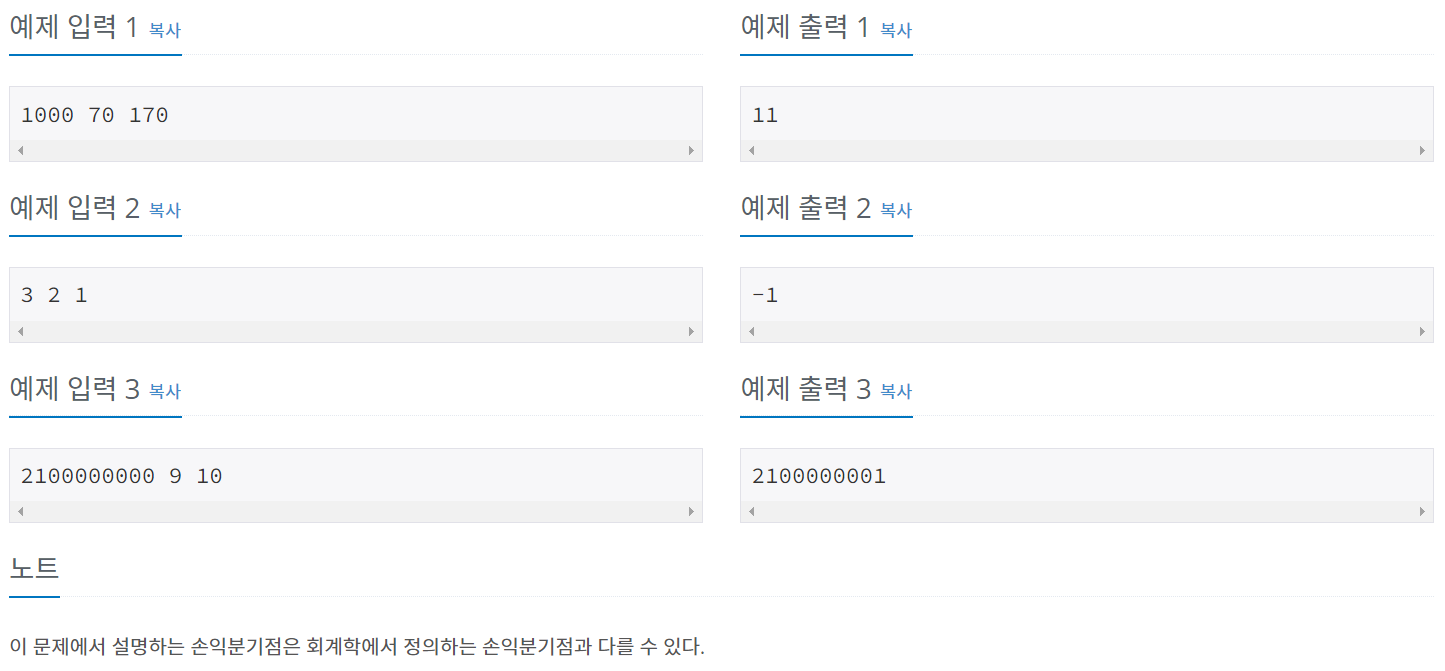 따라서 A/(C-B)+1를 출력해야 한다.