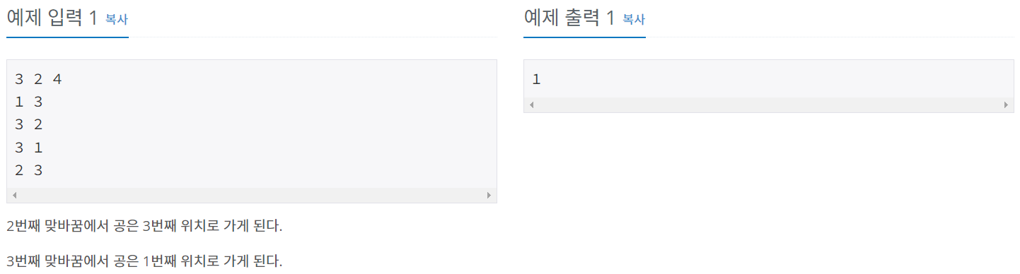 공은 x번째 컵에 있고, 입력된 두 정수 a, b번째 컵의 위치를 서로 바꿔야 하므로