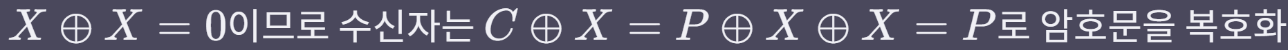 - 만약 송신자와 수신자가 평문 길이만큼의 스트림을 매번 공유할 수 있다면, 스트림을 모르는 공격자는 암호문을 복호화할 수 없다.