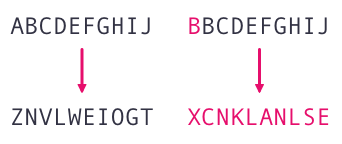 - 평문의 작은 변화가 암호문의 큰 변화로 이어지는 성질